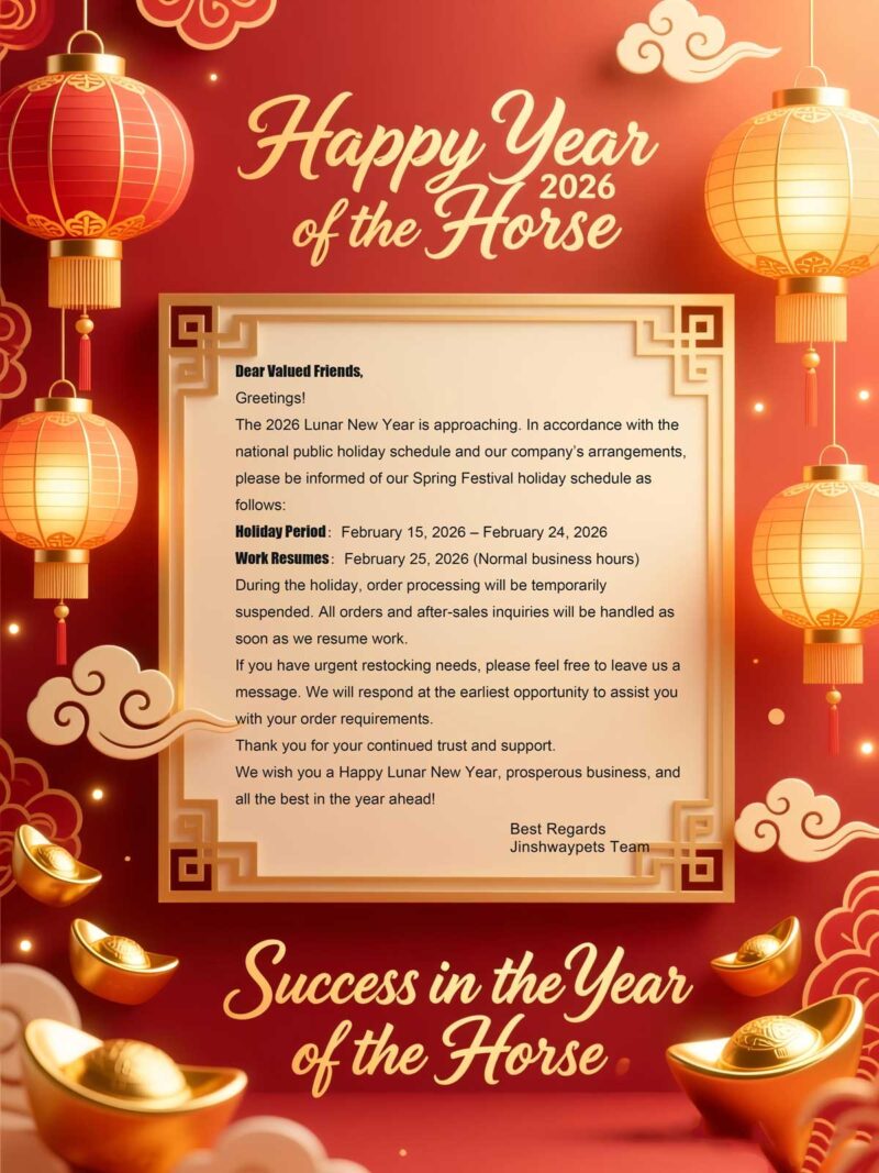 During the holiday, order processing will be temporarily suspended. All orders and after-sales inquiries will be handled as soon as we resume work. If you have urgent restocking needs, please feel free to leave us a message. We will respond at the earliest opportunity to assist you with your order requirements. Thank you for your continued trust and support. We wish you a Happy Lunar New Year, prosperous business, and all the best in the year ahead!